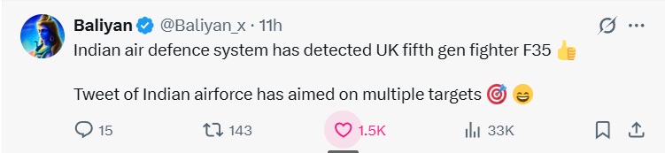 “Indian air defence system has detected UK fifth-gen fighter F-35. Tweet of Indian Air Force has aimed at multiple targets,” an X user stated.